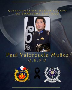En el combate de un incendio en el centro de Santiago, el Cuerpo de Bomberos perdió a uno de sus hijos: Paul Cristoffer Valenzuela Muñoz, Ayudante Primero de la Sexta Compañía, falleció en acto de servicio. Hoy su nombre queda inscrito, con dolor y honor, como el Mártir número cincuenta de la Institución.